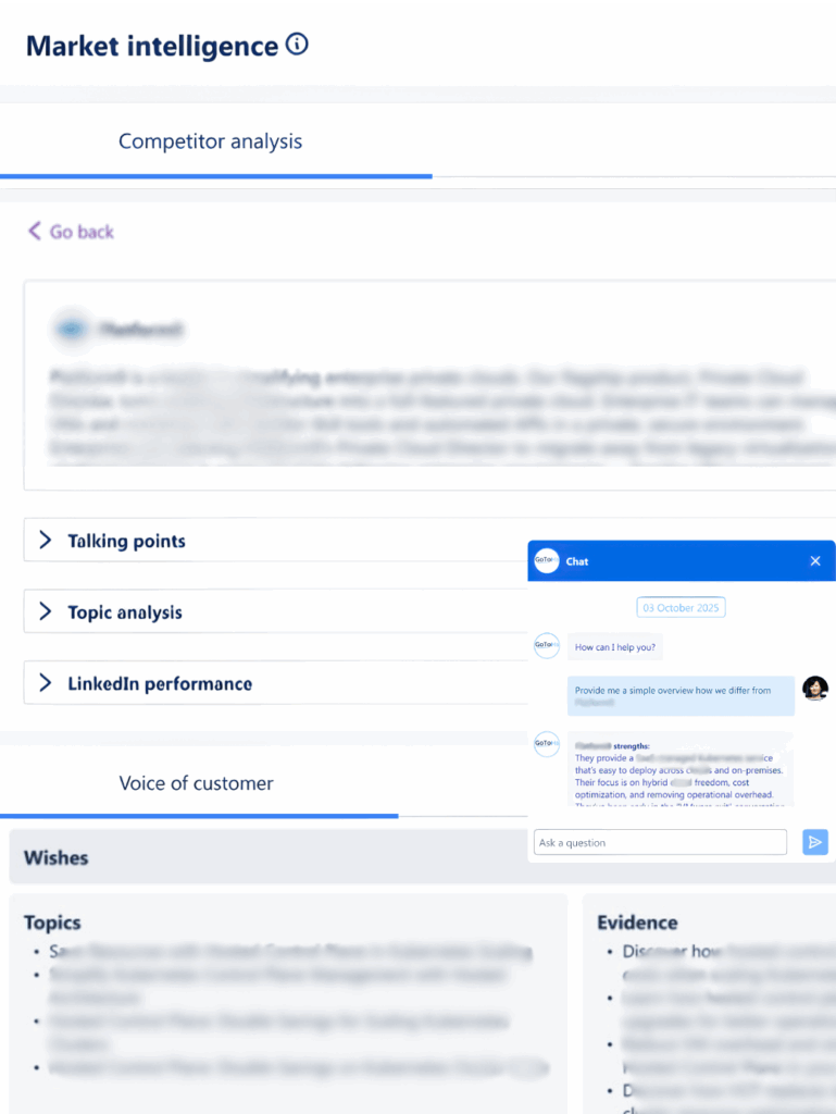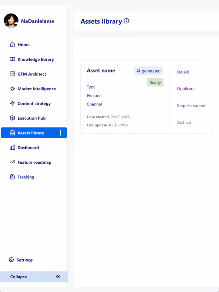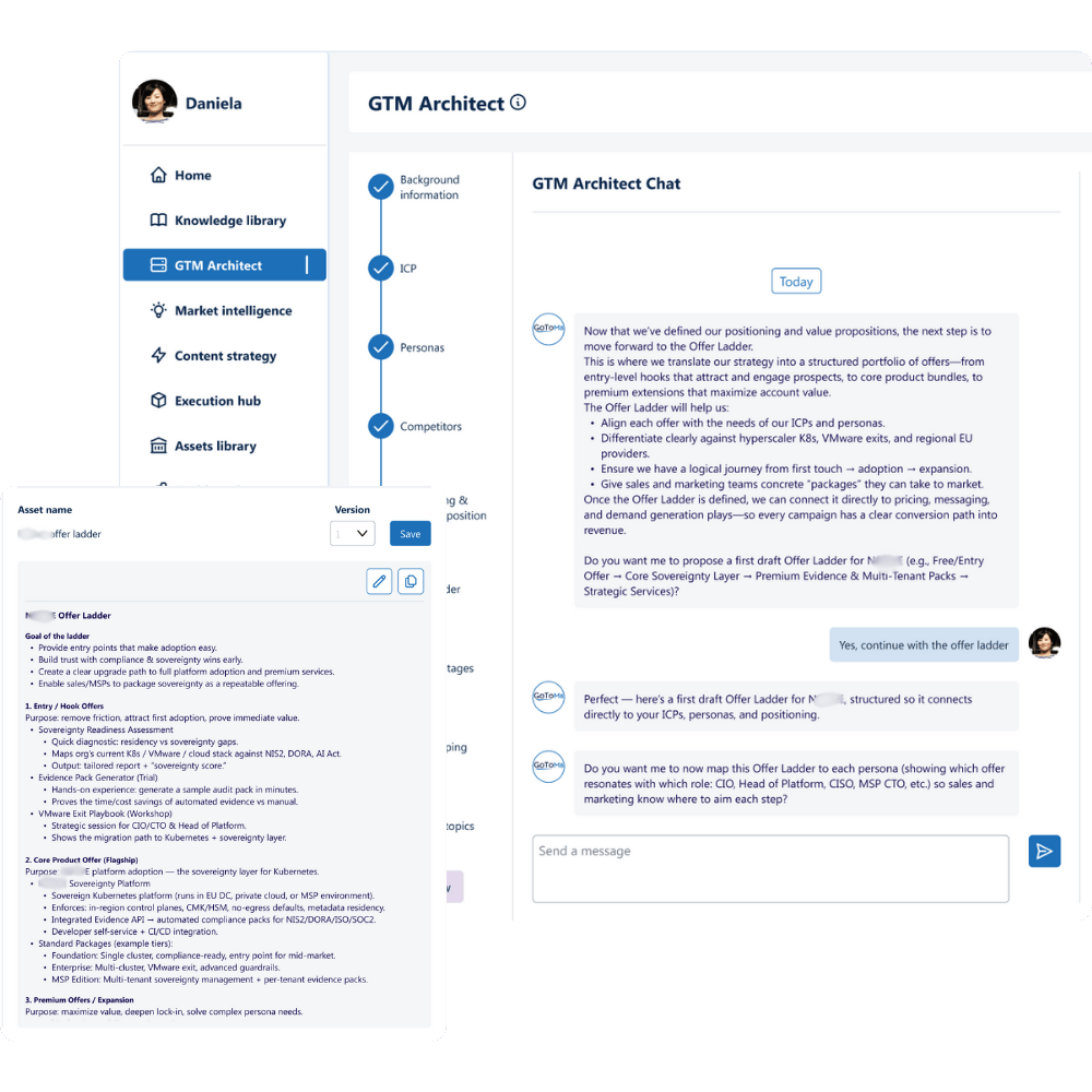 Define and refine GTM strategy, develop plans, and generate assets for marketing, product, and sales in hours, not weeks.