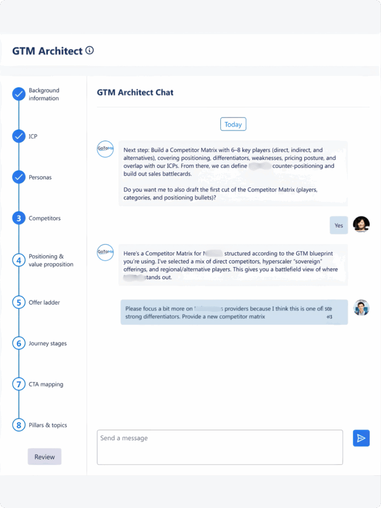 Kickoff conversation captures ICP, competitors, and first-pass positioning. You leave with a shareable GTM snapshot and clear next steps.