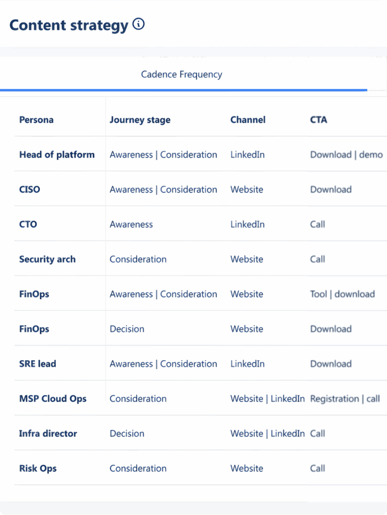 Market signals shape content pillars, talking points, and target channels. Your idea backlog is prioritized and mapped to journey stages.
