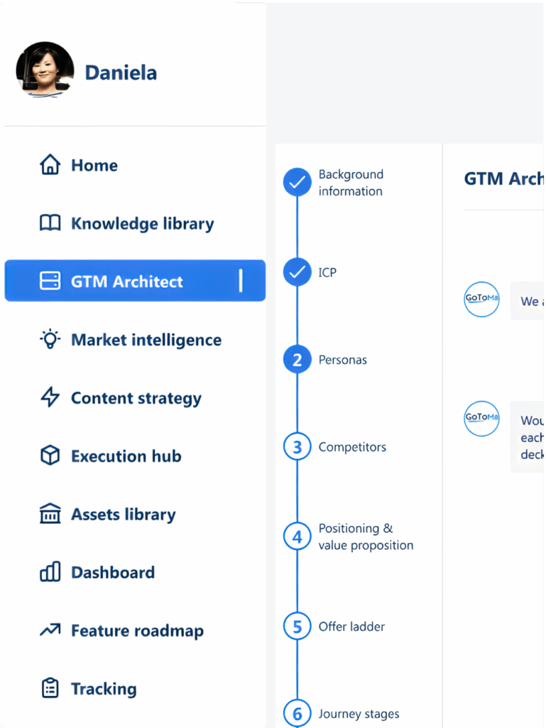 Schedule a strategy session with us today. We’ll show you how GoToM8 will save you hours each week and the benefits of having an AI driven GTM operating system and coach, helping you unify strategy, planning, execution and optimization under one roof.